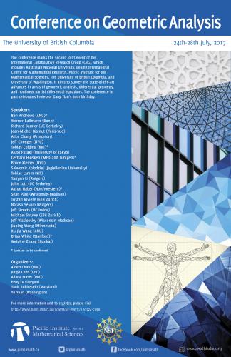 The conference marks the second joint event of the International Collaborative Research Group (CRG), which includes Australian National University, Beijing International Centre for Mathematical Research, Pacific Institute for the Mathematical Sciences, The University of British Columbia, and University of Washington. It aims to survey the state-of-the-art advances in areas of geometric analysis, differential geometry, and nonlinear partial differential equations. The conference in part celebrates Professor Gang Tian’s 60th birthday.