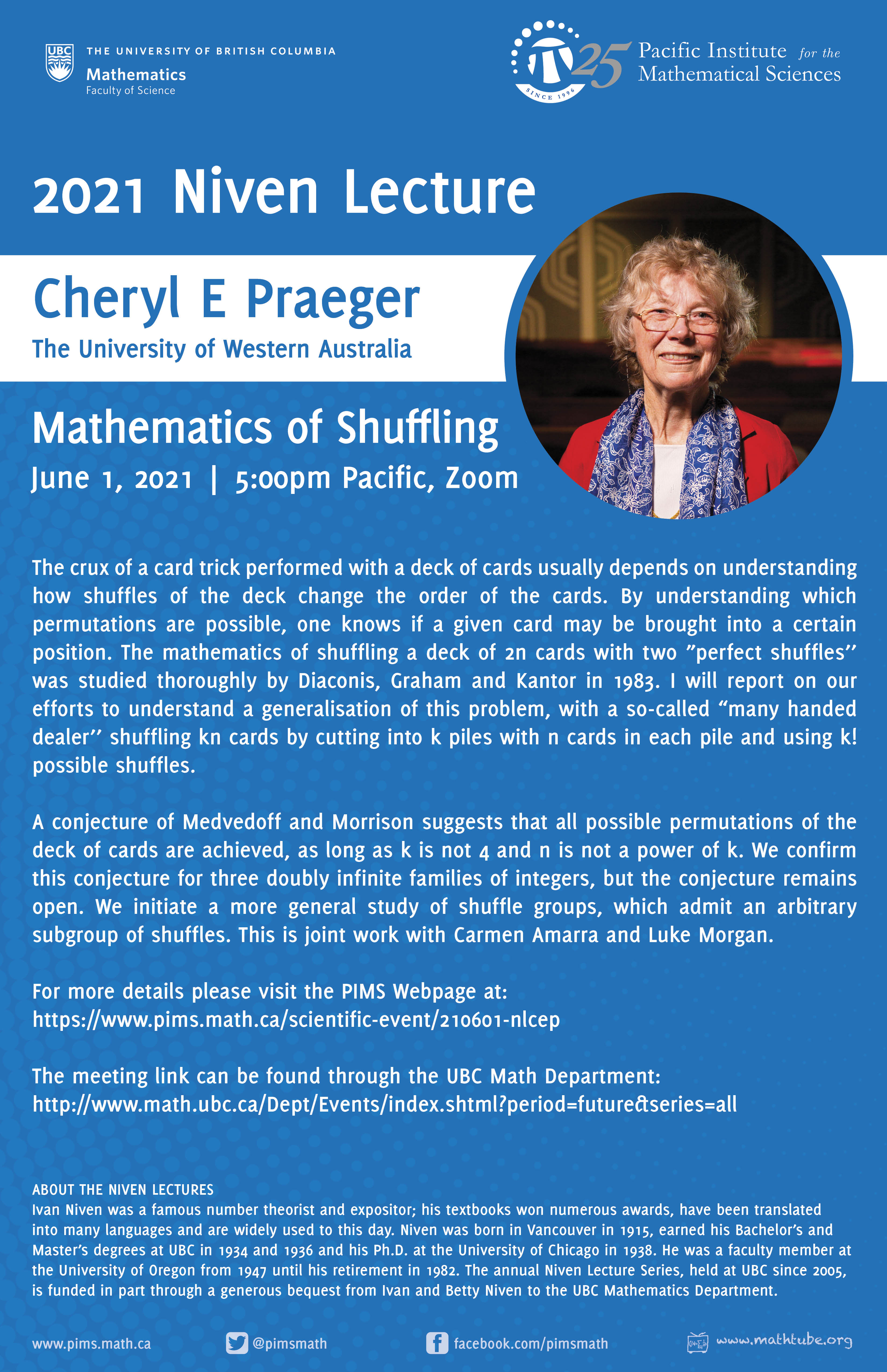 Ivan Niven was a famous number theorist and expositor; his textbooks won numerous awards, have been translated into many languages and are widely used to this day. Niven was born in Vancouver in 1915, earned his Bachelor's and Master's degrees at UBC in 1934 and 1936 and his Ph.D. at the University of Chicago in 1938. He was a faculty member at the University of Oregon from 1947 until his retirement in 1982. The annual Niven Lecture Series, held at UBC since 2005, is funded in part through a generous bequest from Ivan and Betty Niven to the UBC Mathematics Department.