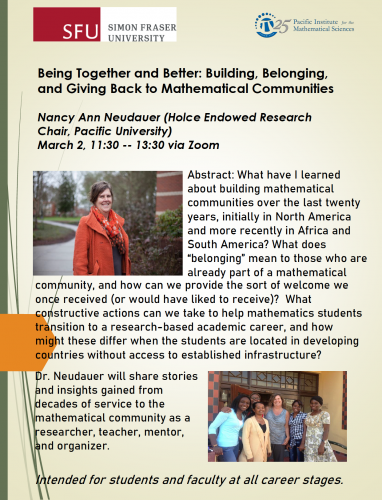 Dr. Neudauer will discuss these and other questions in a special session of the SFU Discrete Mathematics Seminar, intended for students and faculty at all career stages. She will share stories and insights gained from decades of service to the mathematical community as a researcher, teacher, mentor, and organizer.