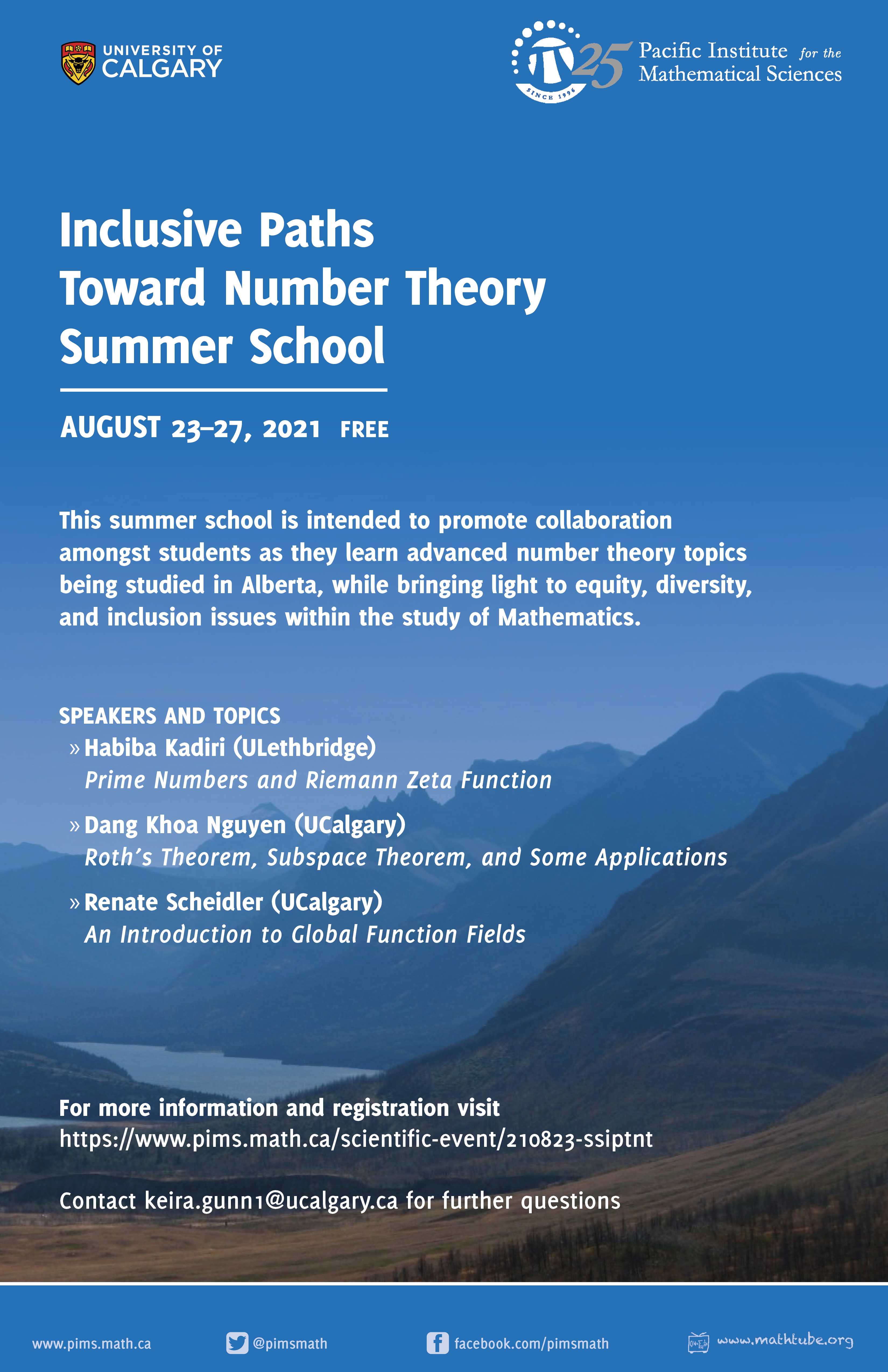 This summer school will introduce students to Number Theory topics being researched throughout Alberta: algebraic number theory, diophantine geometry, and analytic number theory. The goal of this event is to promote positive cooperation and collaboration amongst students, while bringing light to equity, diversity, and inclusion issues within the study of Mathematics.