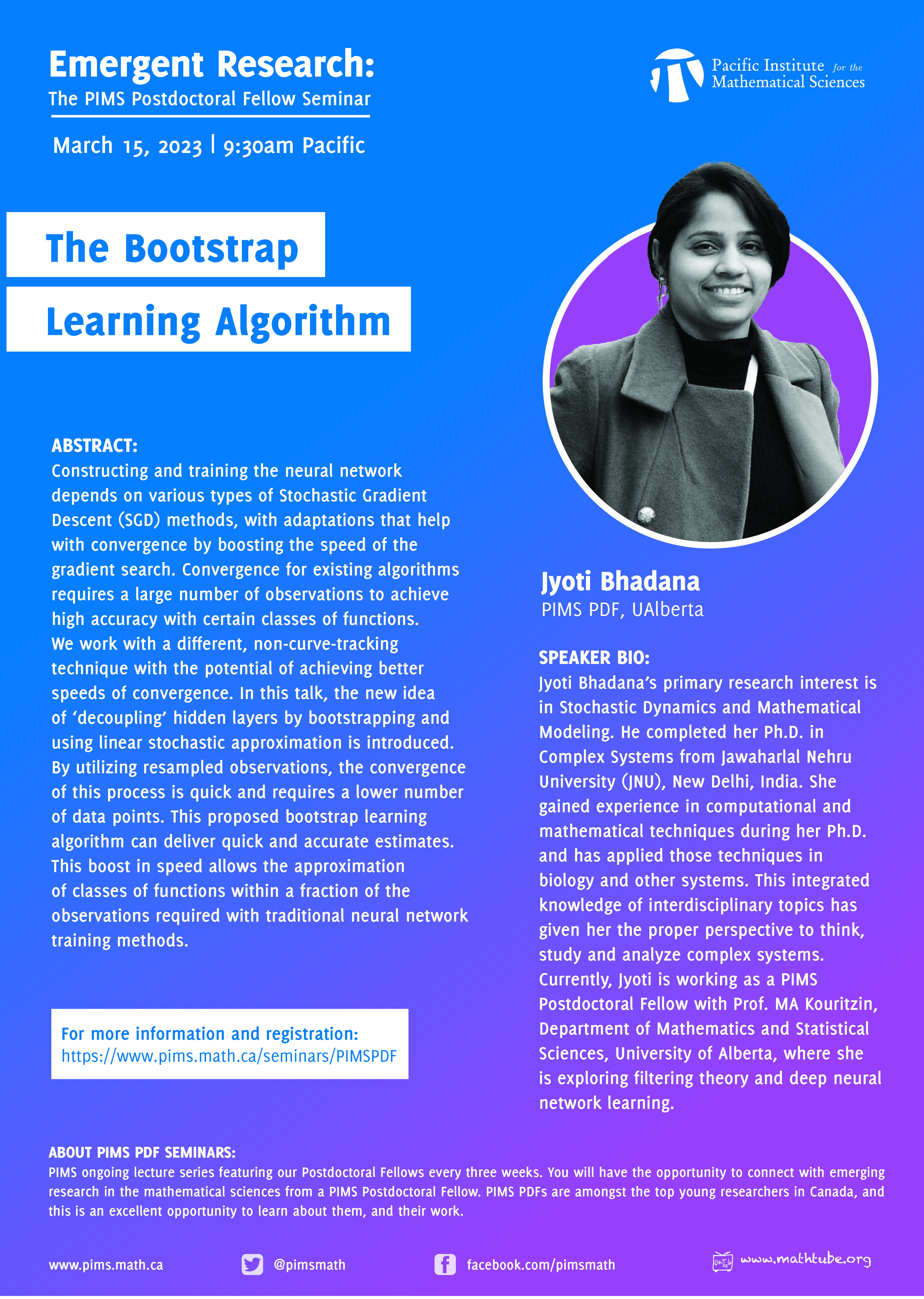 Speaker biography: Jyoti Bhadana's primary research interest is in Stochastic Dynamics and Mathematical Modeling. She completed her Ph.D. in Complex Systems from Jawaharlal Nehru University (JNU), New Delhi, India. She gained experience in computational and mathematical techniques during her Ph.D. and has applied those techniques in biology and other systems. This integrated knowledge of interdisciplinary topics has given her the proper perspective to think, study and analyze complex systems. Currently, Jyoti is working as a PIMS Postdoctoral Fellow with Prof. MA Kouritzin, Department of Mathematics and Statistical Sciences, University of Alberta, where she is exploring filtering theory and deep neural network learning.
